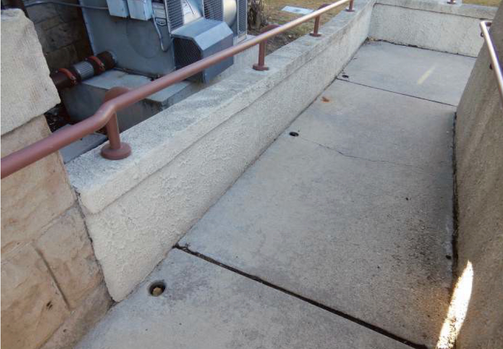 The stucco walls at the eastern exterior ramp have large and small surface cracks in the finish.
